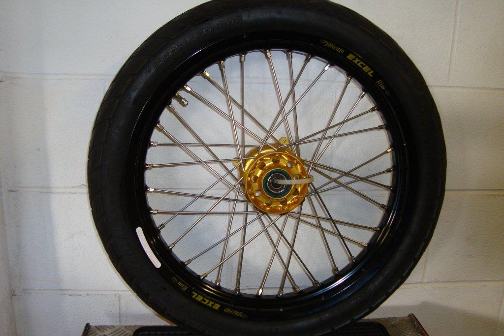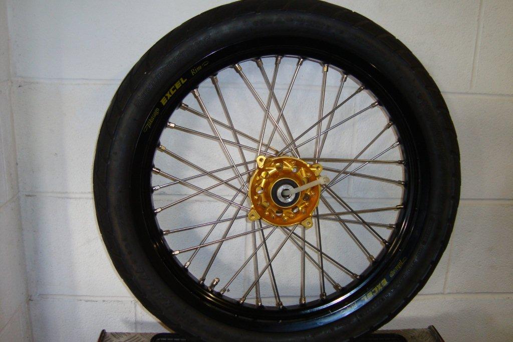 Front 19" x 2.5" Flat Track/Adventurer wheel, Talon Gold Hub. Black Excel rim. This is a perfect touring front wheel. Ecepts all the Adventurer/Trail Touring tyres like the TCK 80. This wheel is very stable at high speed and also capable of off road as well |
